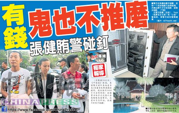 (吉隆坡29日訊)《中國報》探悉,泰國警方前往泰南普吉島1間豪華別墅逮捕張健時,搜出值約5000萬令吉的財物;張健曾當場多次試圖以金錢賄賂泰國警員,后者卻不為所動,張健只好束手就擒!
