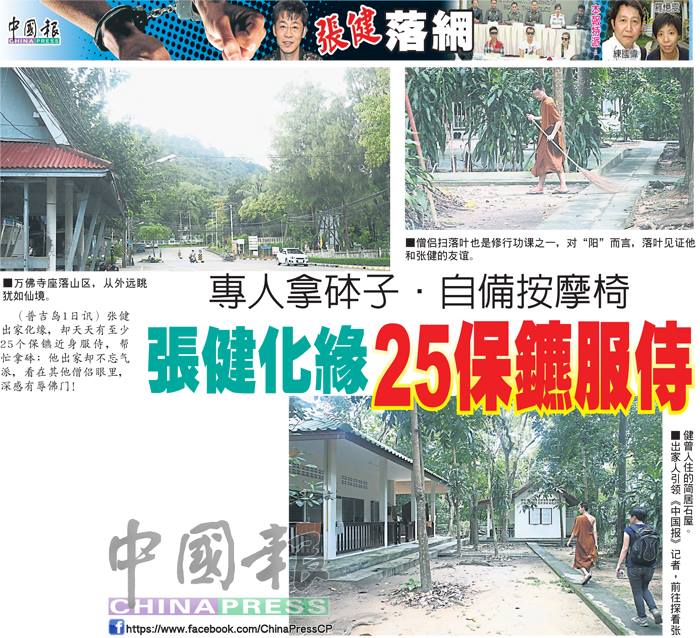(普吉島1日訊)張健出家化緣,卻天天有至少25個保鑣近身服侍,幫忙托缽;他出家卻不忘氣派,看在其他僧侶眼裡,深感有辱佛門!http://www.chinapress.com.my/node/573724