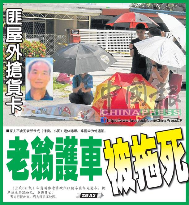 Peng Shih Cheng, 65, died at the scene some 25 metres from his house at Taman Golden City. He had tried to stop the thief from driving away with his Toyota Vigo car at about 10am Sunday by hanging on to the door.
