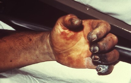 Bubonic plague infection causes tiny blood vessels in the hands and fingers to clog up and cut off circulation. Without blood, the flesh dies and turns black (called “gangrene”). This is why in the Middle Ages bubonic plague was called “the Black Death.”(http://rarediseases.about.com/od/infectiousdiseases/ig/Pictures-of-Bubonic-Plague/hand-gangrene.htm)