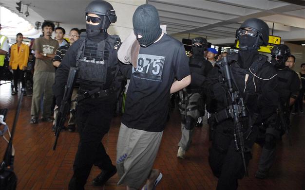 Elite Indonesian anti-terror police from Detachment 88 escort four Turks arrested on arrival at Jakarta airport on Sept. 14. AFP Photo