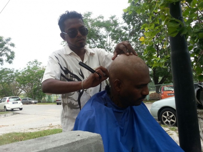 With the first anniversary of the accident falling next Friday, Selvam went bald today at 10am to offer his penance to Lord Muruga Perumaan, his favourite Hindu deity, at the Sri Bala Murugan Alayam.