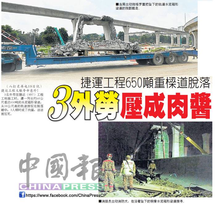 Three MRT construction workers, all Bangladeshis, are feared dead after being trapped under a 300-tonne concrete span that collapsed at the MRT worksite near former Rubber Research Institute (RRI) in Kota Damansara last night.