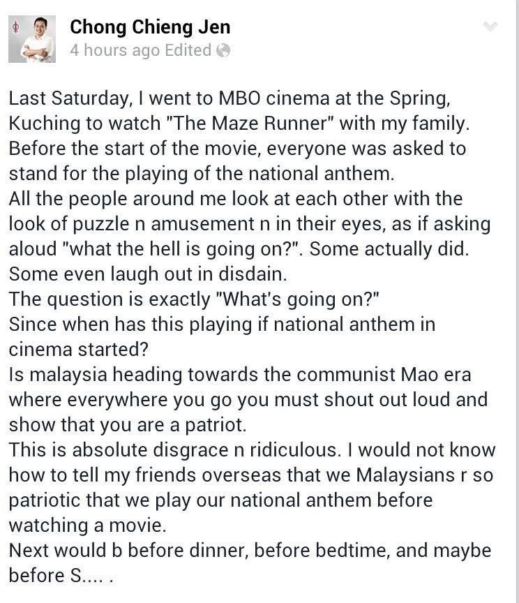 In a Facebook posting on Tuesday, Kuching MP Chong Chieng Jen criticised having to stand up for the national anthem before watching a film, calling it a ‘disgrace and ridiculous’.