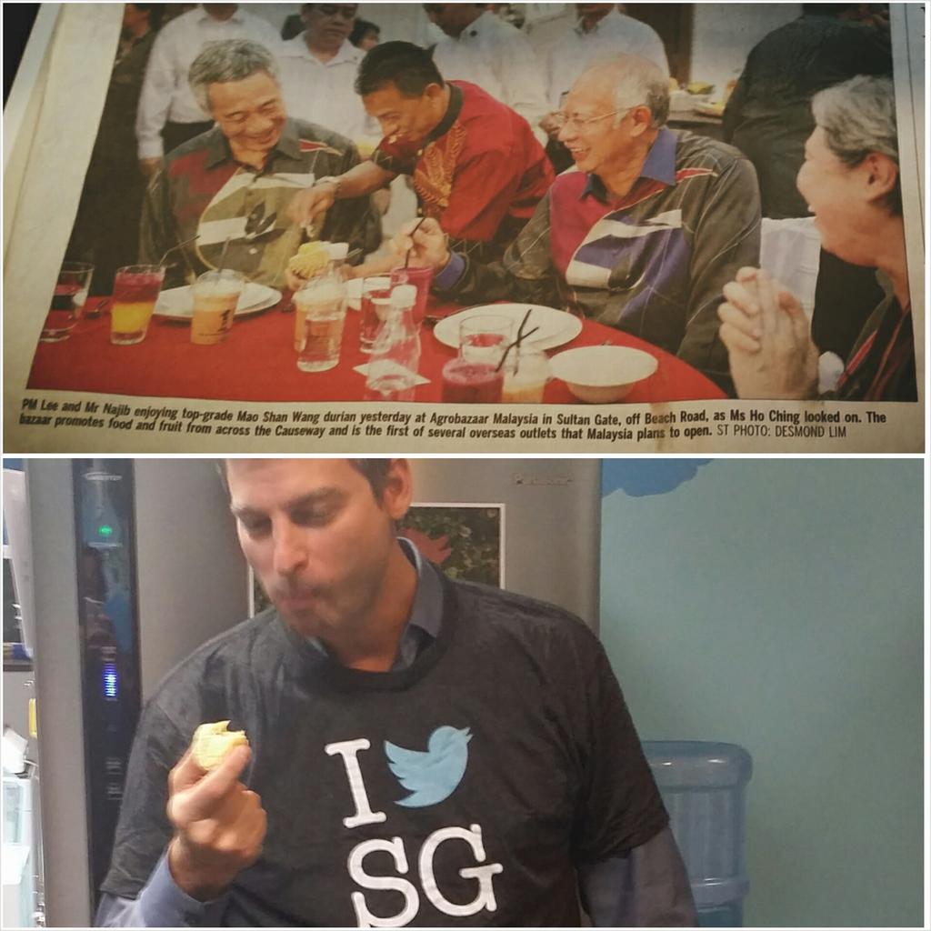 @STcom this morning –@leehsienloong having durian! Guess what-@adambain did the same@TwitterSG pic.twitter.com/yrNn0xQuw5…