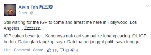 In new Facebook posting, Alvin Tan taunts IGP and says he would likely never get caught by him.