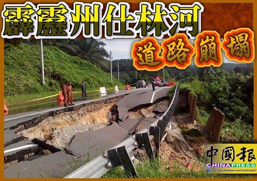 中國報訊:霹靂州仕林河瓜拉仕林道路昨晚8時許崩塌,範圍寬8公尺、長34公尺及45公尺深,令人觸目驚心;事發路段現已關閉,無人傷亡。