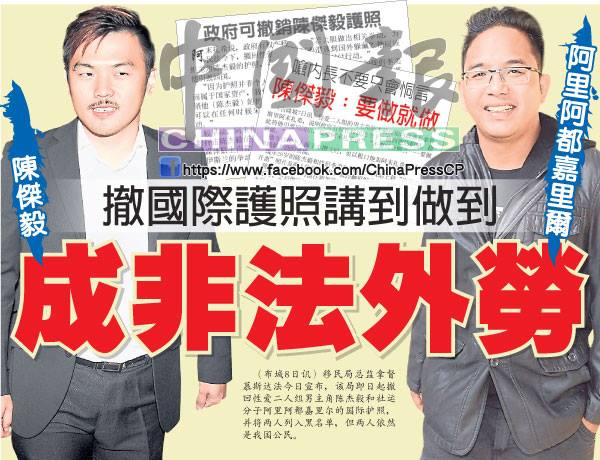 (布城8日訊)移民局總監拿督慕斯達法今日宣布,該局即日起撤回性愛二人組男主角陳傑毅和社運分子阿里阿都嘉里爾的國際護照,並將兩人列入黑名單,但兩人依然是我國公民。