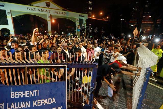 “Bangkit! Bangkit! Bangkit Rakyat! Buka pintu! Buka pintu! Masuk UM!” he chants, and the crowd of students around him picks up the cry.