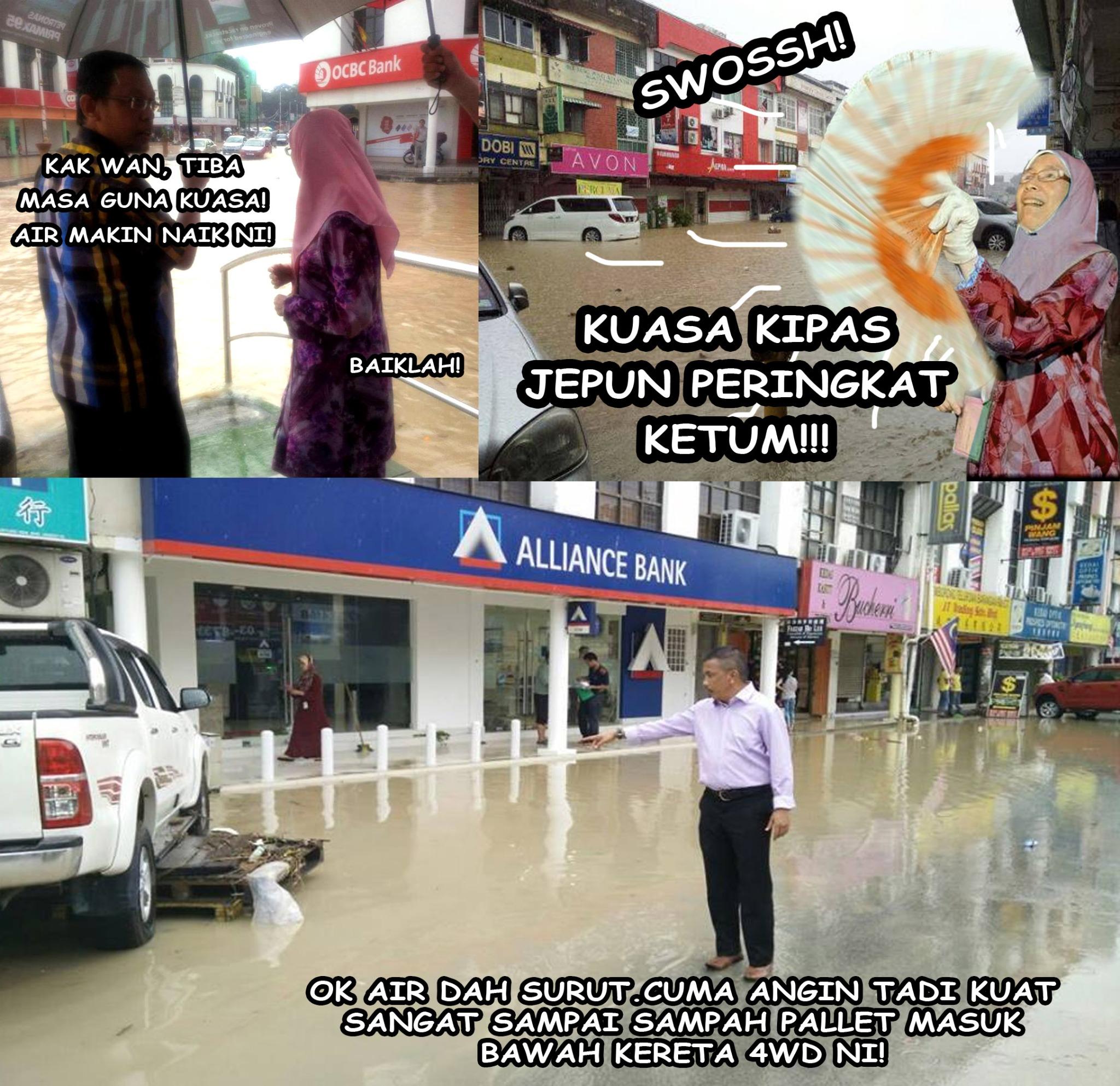 Bersembur aku ketawa. Dari kejauhan menerima whatsapp kwn lawak banjir Kajang. Kuikuikuijuuiihuw!