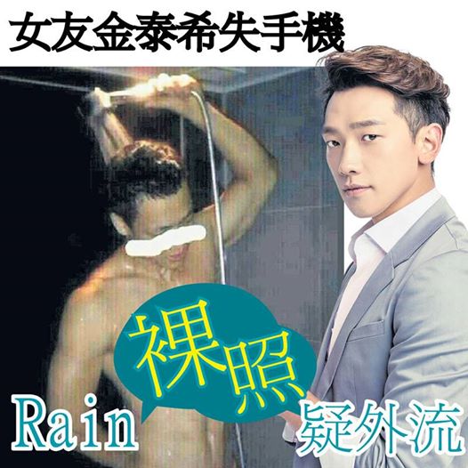 當粉絲期待2人拉埋天窗之際,前日韓國媒體卻驚爆網上流傳Rain的裸照,據報道所指,近日在韓國討論區上流傳一張Rain沖涼的裸照,並指相片流出是因 為早前金泰希遺失手提電話,令到手機內的照片亦曝光,不過照片並未見到Rain本人容貌,當中眼部及下身都有圖案遮掩,但從身形及輪廓來睇,疑似裸照都有 幾分似Rain。