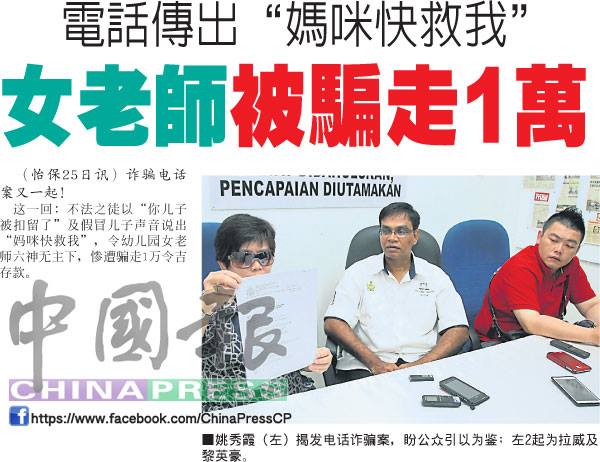 這一回:不法之徒以“你兒子被扣留了”及假冒兒子聲音說出“媽咪快救我”,令幼兒園女老師六神無主下,慘遭騙走1萬令吉存款。http://www.chinapress.com.my/node/579919