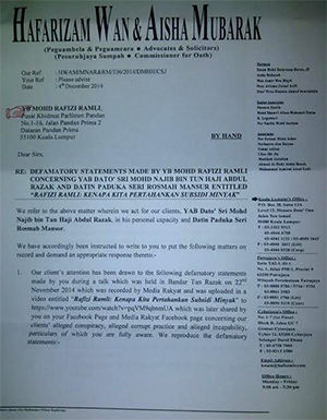 Prime Minister Najib Abdul Razak has slapped PKR leader Rafizi Ramli with a legal threat for accusing him of plundering the nation for among others to purchase diamond rings for his wife Rosmah Mansor.