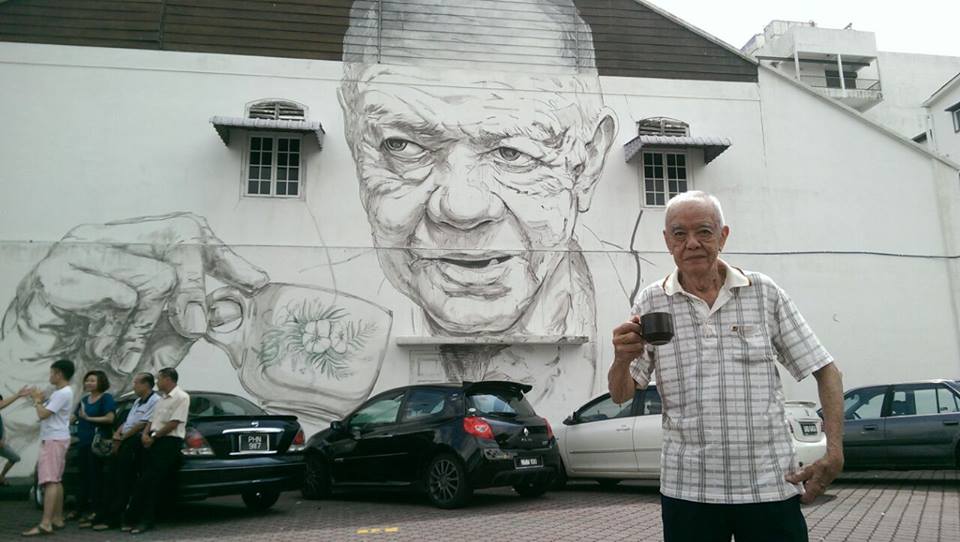 The Art of OLDTOWN with Ernest Zacharevic – Old uncle with coffee cup mural
