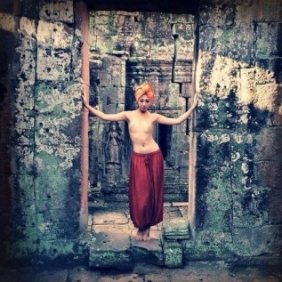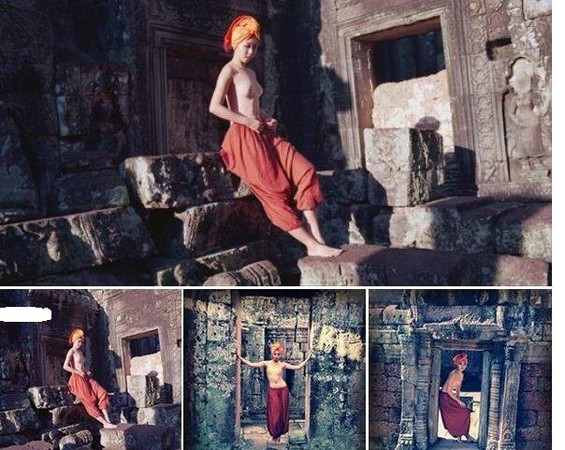 The portraits of the topless woman in Apsara dancer garb were likely snapped during a quiet moment at the Banteay Kdei temple, said Khieu Thy, president of the Angkor Tourist Guide Association.