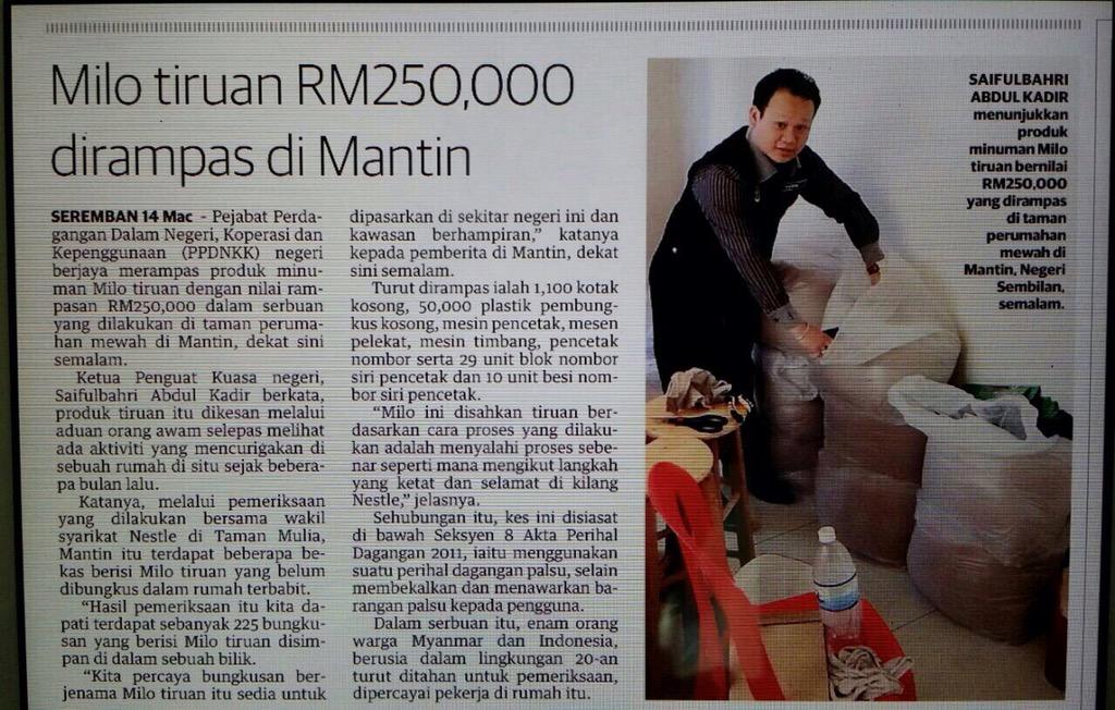 Based on a report by Sinar Harian, Domestic Trade, Cooperatives and Consumerism Ministry on Friday seized RM250,000 worth of fake Milo products at an elite residential area in Mantin, Negeri Sembilan. State chief enforcer Saifulbahri Abdul Kadir said this was done after receiving many complaints from members of the public.