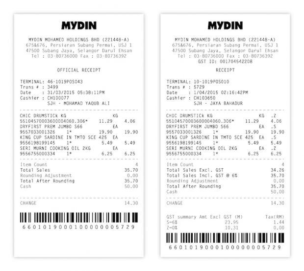 The only difference is that the April 1 receipt displays the amount of the GST — which replaces the previous system of Sales and Services Tax (SST) of between five and 10 per cent.