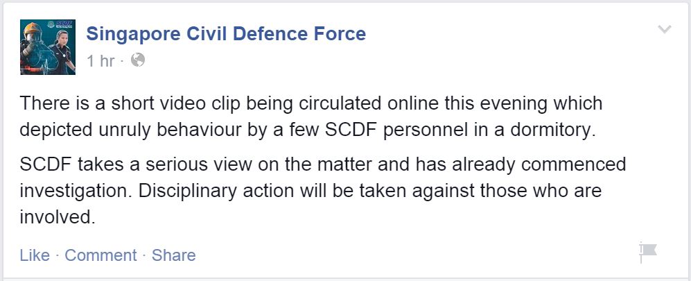 “There is a short video clip being circulated online this evening which depicted unruly behaviour by a few SCDF personnel in a dormitory,” SCDF said in a statement posted on Facebook.