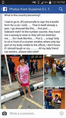 PETALING JAYA: A woman had a shock at a Road Transport Department (JPJ) office when she was forced to wear a sarong or be refused service. In a Facebook post, Suzanna G L Tan said she was at the JPJ office to transfer the ownership of her car after selling it. She also posted a photograph of herself outside the office, wearing a blouse with a skirt that ended just above the knee. Another photograph showed her wearing a sarong sitting at the JPJ counter. “I had to go to JPJ personally to sign the transfer form for the car I sold. That in itself is already a pain,” Tan wrote. “I go dressed like this. Indecent meh?” she asked in reference to her dressing in the photograph. Tan said while she was at the counter to get a queue number when she was handed a sarong to wear “or they would not entertain me”. http://www.thestar.com.my/News/Nation/2015/06/08/RTD-forces-woman-to-use-sarong-over-skirt/ — theSundaily