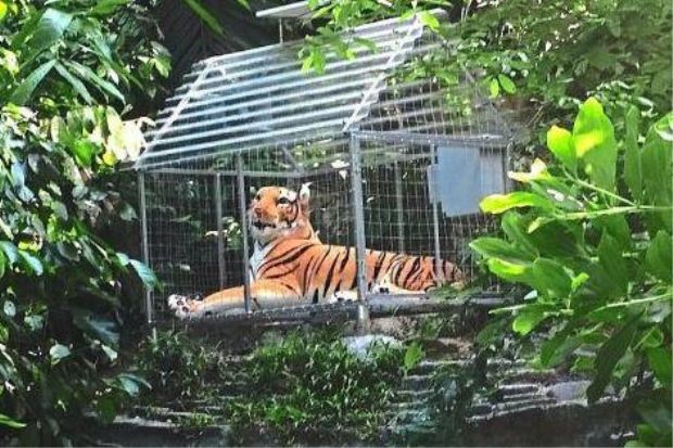 Soft toys were put in cages to scare away the monkeys but monkeys are smart, definitely smarter than whoever put up that toy tiger!