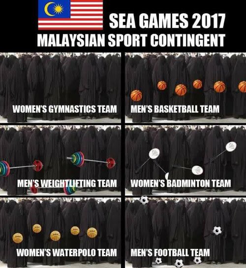 Another suggested our sportspeople wear the burqa, a large flowing garment that envelops the entire body from head to toe. Showing off how versatile the garment could be, a group garbed in the burqa are photoshopped carrying basketballs, holding weights, badminton rackets, water polo balls and footballs under the banner “Sea Games 2017 Malaysian Sports Contingent”.