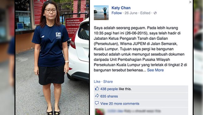 — 29 June 2015 “No, you can’t come in. Got long pants, ah?” Lady lawyer was stopped by a security guard on duty at the Federal Territories Director of Land and Mines’ office. Free Malaysia Today