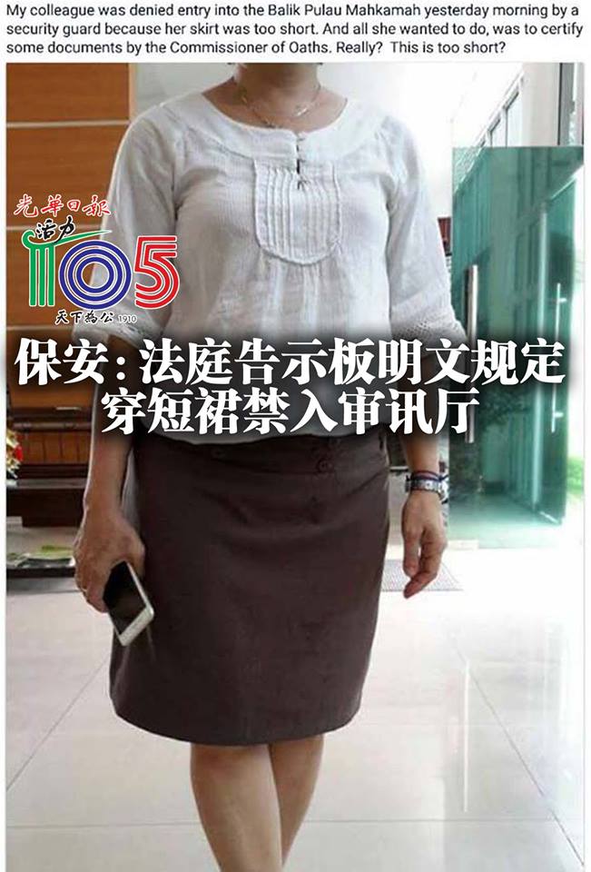 这场风波纯属误会! 槟岛浮罗法庭禁止女性穿短裙入内的风波其实并非今天方出现的问题,法庭保安人员向记者透露,法庭布告版上已明文规定:所有穿短裙短裤及圆领衣服的男女皆不可进入法庭以示尊重。 据一名不愿透露姓名的保安人员告诉《光华日报》,一般上有关人士若只是在楼下办理手续,包括会见宣誓官,他们并不会刻意拦阻,只有上楼进入审讯厅范围他们才会阻止。