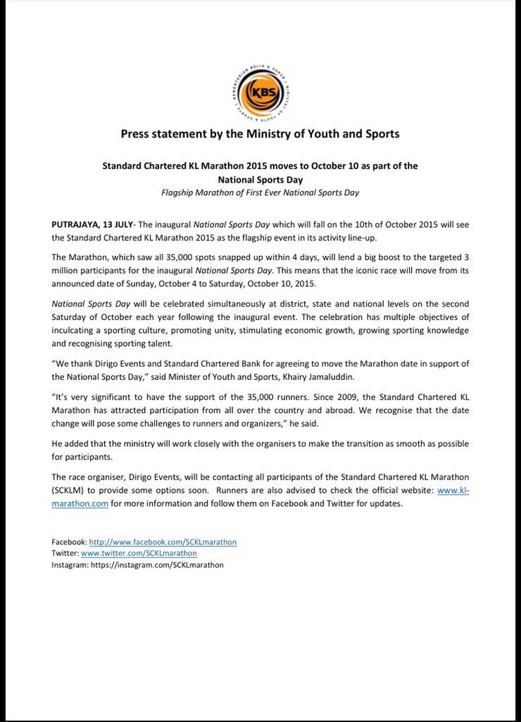 “I’ve read all your tweets, Facebook messages and emails regarding the date change of the Standard Chartered KL Marathon 2015.