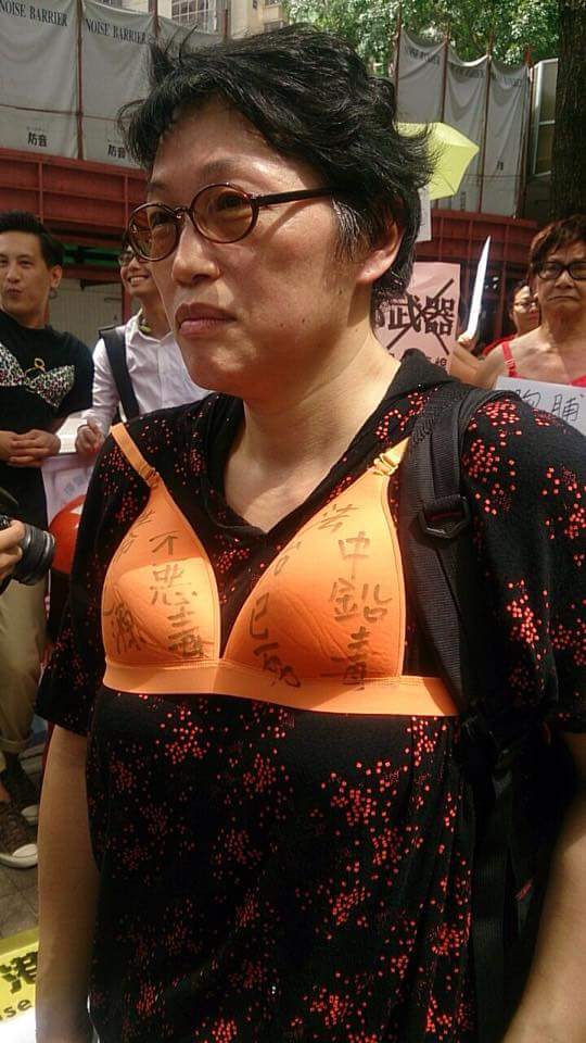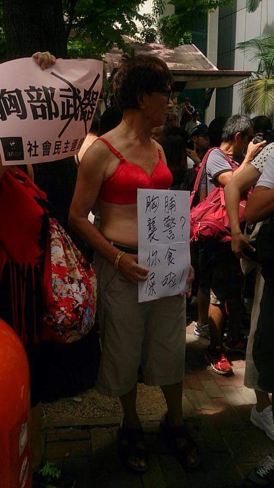Regardless of sex, demonstrators strapped bras to their chest to show support for Ng, including social worker Jordi Tsang Sing-cheung.