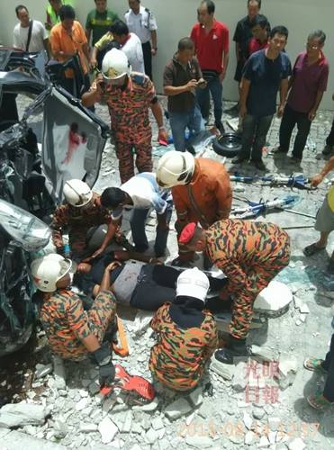 GEORGE TOWN: A car driven by a 49-year-old woman plunged three floors down from a multi-storey car park here today. The woman was pinned in her seat and sustained serious bodily injuries. The car landed on its side with shattered windscreen all over the floor.