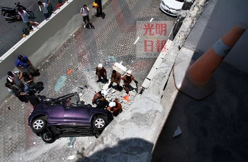 在4樓停車場開車外出,轉入3樓停車場下斜道時,相信錯踩油門使轎車加速撞毀圍欄,再直墜樓下地面,轎車落地後四輪朝天… http://bit.ly/1WolXWM