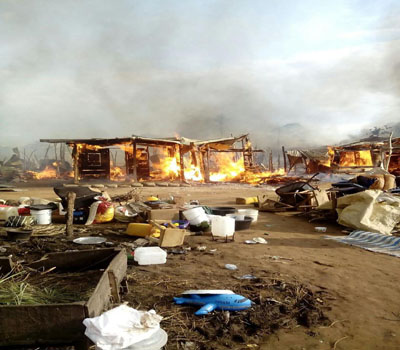 More than 200 of them gathered at the town’s cattle market where their former homes once stood, and began setting fire to other buildings in the area.