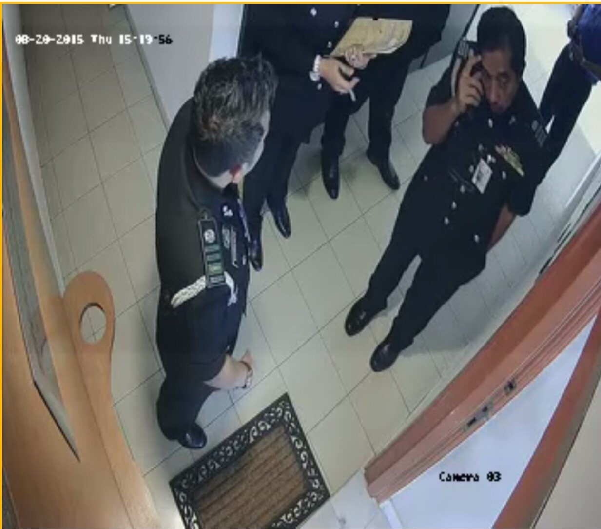 A screen grab from a security camera provided by Ms Jessica Gurmeet Kaur’s lawyer showing police officers at the woman’s house.