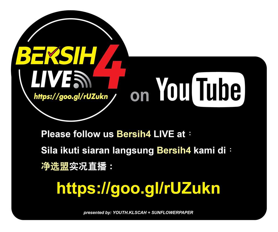 【BERSIH4LIVE】自己BERSIH自己播!我们诚意邀请你见证BERSIH4.0集会现场直播。公民社会首次自行现场直播,借此平台让无法出席集会的人士,网上观看集会实况。同时也将连线其他地区Bersih集会,跨越地理障碍。请订阅YouTube频道: http://bersih4live.com/Civil society first ever attemption to broadcast Bersih4 in LIVE, Rallies in multiple nations will be connected this time. Please subscribce and follow our YouTube Channel (http://bersih4live.com/)Presented by: KLSCAH YOUTH 隆雪华青 SunflowerPaper