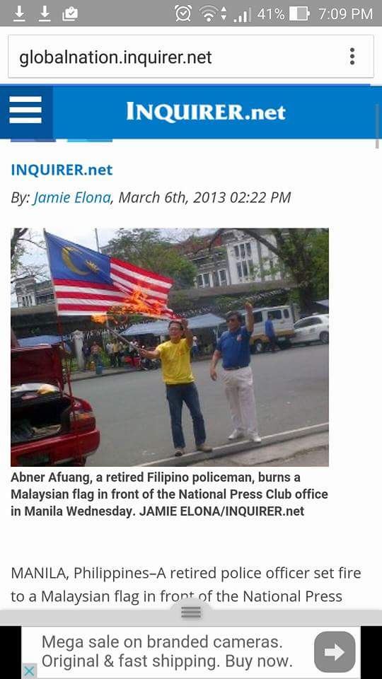 The Facebook users posted a screen capture of a March 6, 2013 news report by the Philippines’ news portal INQUIRER.Net, where a retired Filipino police officer had set fire to a Malaysian flag to protest the Aquino administration’s condemnation of the Sulu gunmen who intruded Sabah.