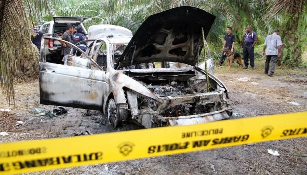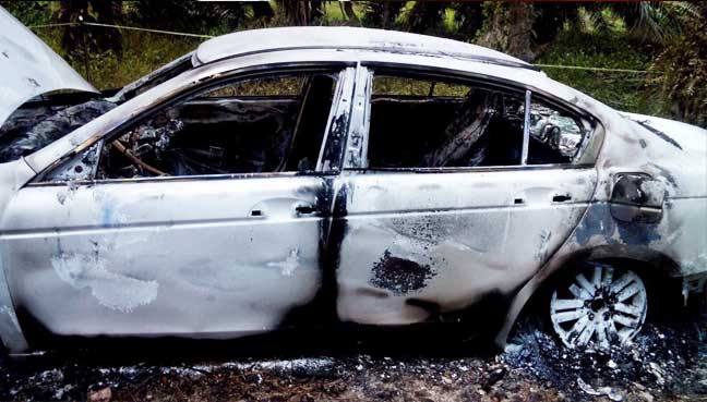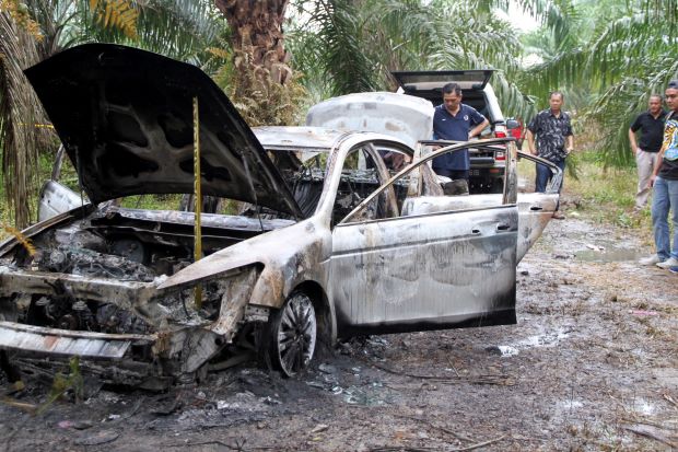 The wreckage of a burnt car has been found at an oil palm plantation at Kampung Sungai Samak, near Hutan Melintang, Perak.