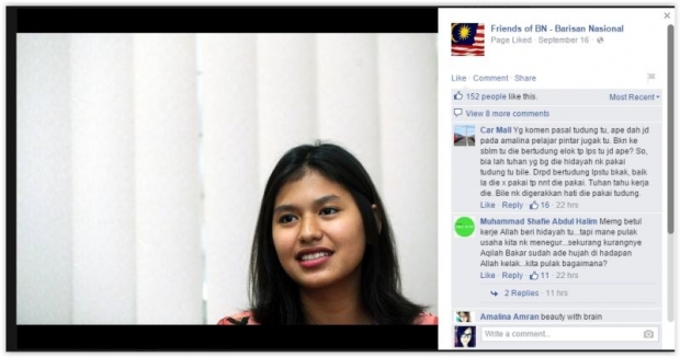 Facebook user Mohd Sabri Hussien said: “Pretty looks, good at studies. It’ll be better if she wore a tudung”.