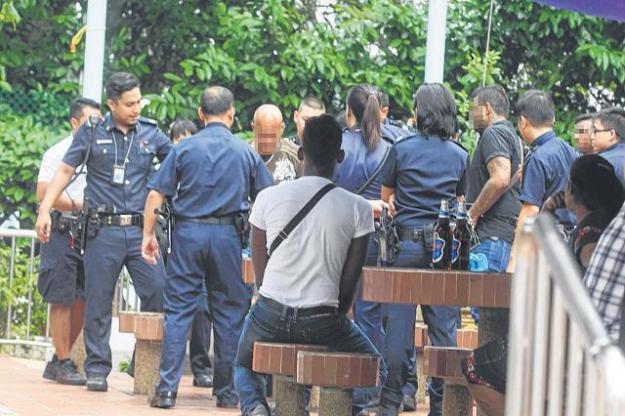 About 10 tattooed men were interrogated by policemen in the Outram Park area.