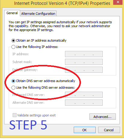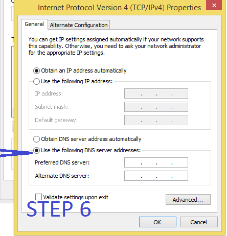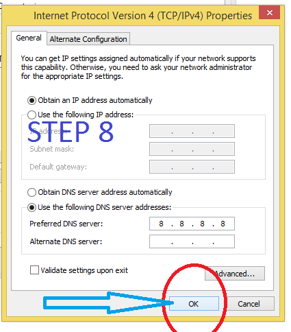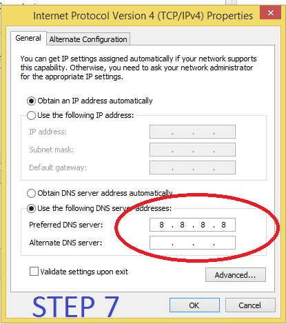 8. At ‘Preferred DNS server’ type in 8 . 8 . 8 . 8 (i.e type 8 into each of the boxes) (for Yes broadband for example)