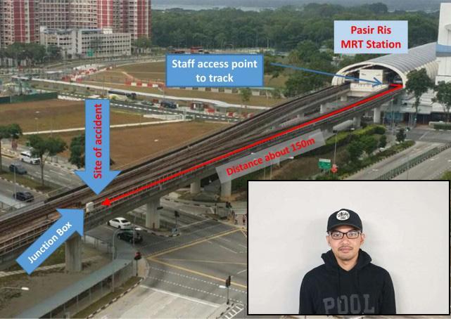 Mr Nasrulhudin (inset, left) and Mr Asyraf (inset, right) were in a team of 15 on a walkway beside the eastbound tracks, about 150m from the platform at Pasir Ris MRT station, when tragedy struck. — PHOTO: The Straits Times, Facebook