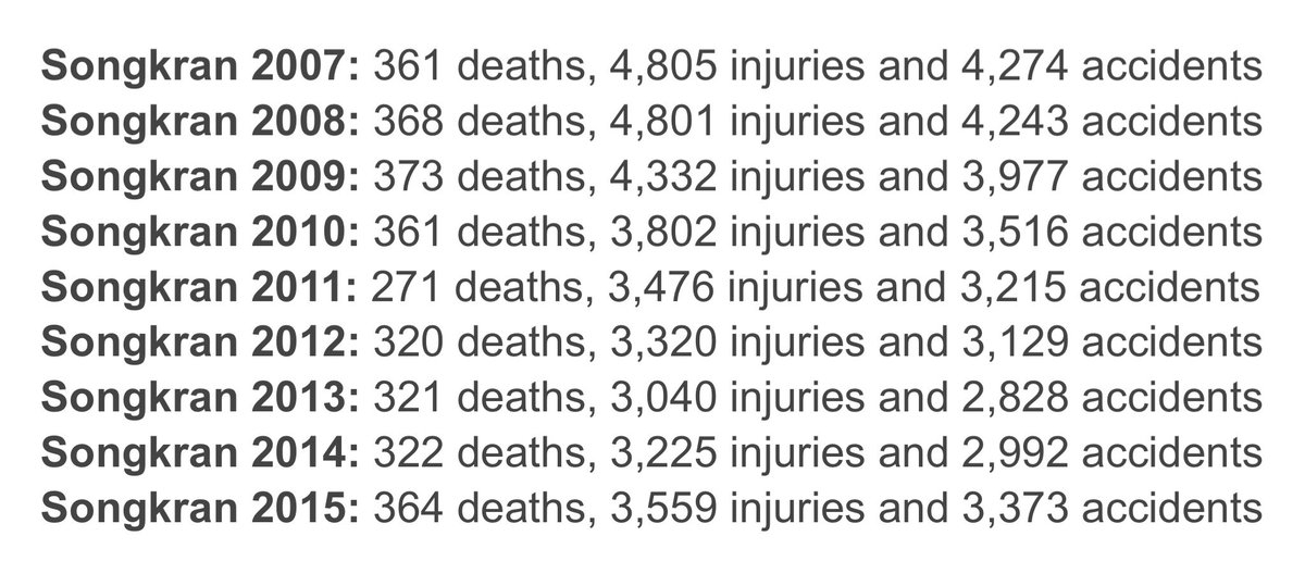 364 people died on the roads during Songkran 2015. Most accidents caused by drunk drivers: http://www.richardbarrow.com/2015/04/full-road-accident-statistics-for-songkran-2015/ …