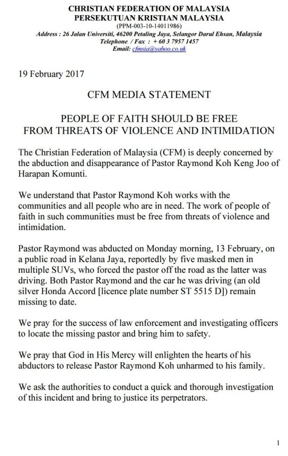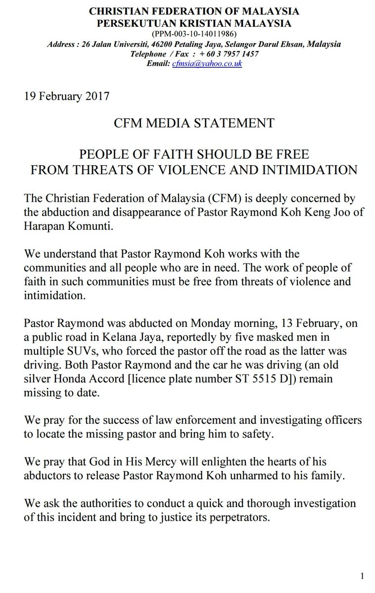 IGP: Pastor Raymond Koh may have been abducted by human traffickers. Missing since 13 Feb 2017.