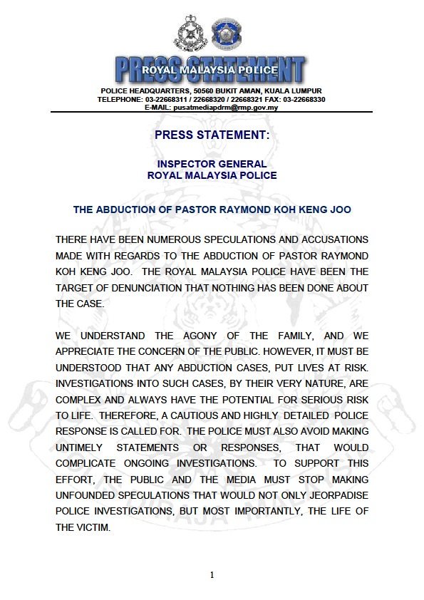 IGP: Pastor Raymond Koh may have been abducted by human traffickers. Missing since 13 Feb 2017.