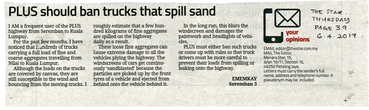 PLUS must ban such trucks so that truck drivers must be more careful to prevent their loads from spilling or leaking onto the highway @LLMKP