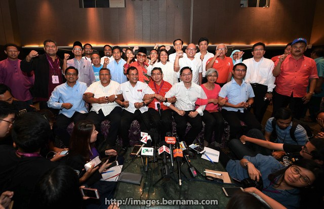 JOHOR BAHRU, 10 Mei — Timbalan Parti Amanah Negara (PAN) Salahuddin Ayub (duduk tengah) meraikan kejayaan setelah menang dalam Pilihan Raya Umum ke-14 hari ini.