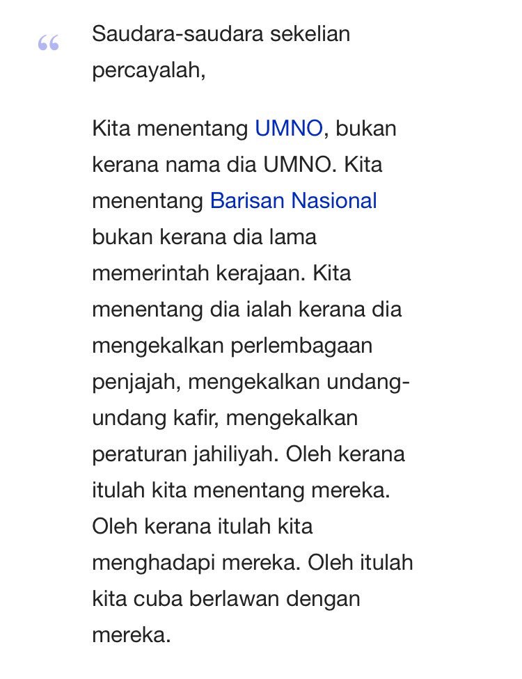 Kita menentang UMNO, bukan kerana nama dia UMNO. Kita menentang Barisan Nasional bukan kerana dia lama memerintah kerajaan. Kita menentang dia ialah kerana dia mengekalkan perlembagaan penjajah, mengekalkan undang-undang kafir, mengekalkan peraturan jahiliyah. Oleh kerana itulah kita menentang mereka. Oleh kerana itulah kita menghadapi mereka. Oleh itulah kita cuba berlawan dengan mereka. Perjuangan kita adalah jihad, ucapan kita adalah jihad, derma kita adalah jihad. Bergantunglah kita kepada Allah dengan (menghadapi) puak-puak ini kerana kalau kita mati melawan puak-puak ini, mati kita adalah syahid. Mati kita adalah Islam. Kita tidak perlu masuk Buddha, Kita tidak perlu masuk Hindu, Kita tidak perlu masuk Kristian, Tapi kita menjadi kafir dengan mengamalkan ‘politik suku, agama suku’. |