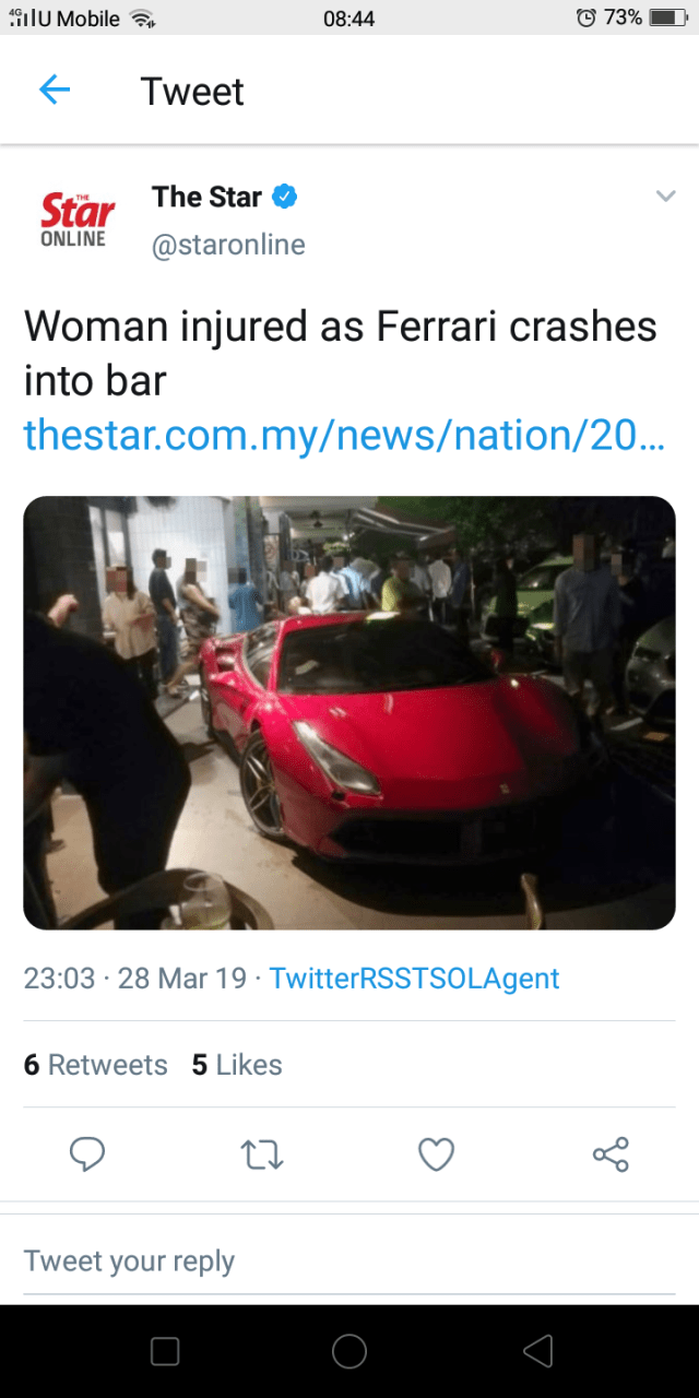 Ferrari crashes into bar in Kuala Lumpur, injuring woman https://t.co/P25HWLTUgU pic.twitter.com/Vbvbqs7HSh