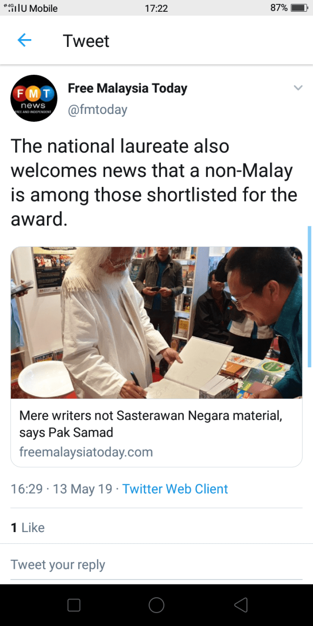 The national laureate also welcomes news that a non-Malay is among those shortlisted for the award. https://t.co/D2AFUsurb5 — Free Malaysia Today (@fmtoday) May 13, 2019