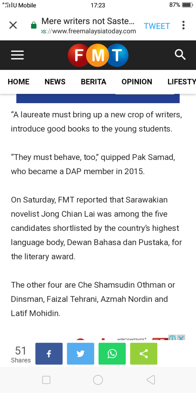 The national laureate also welcomes news that a non-Malay is among those shortlisted for the award. https://t.co/D2AFUsurb5
