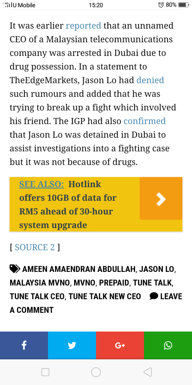 KUALA LUMPUR (Nov 9): Tune Talk chief executive officer Jason Lo has denied media reports that he was detained in Dubai recently for possession of drugs.In a statement to theedgemarkets.com, Jason said he was sent to the police lock up because he tried to help his friend who attempted to break up a fight and he had grappled with a man who turned out to be an undercover cop.